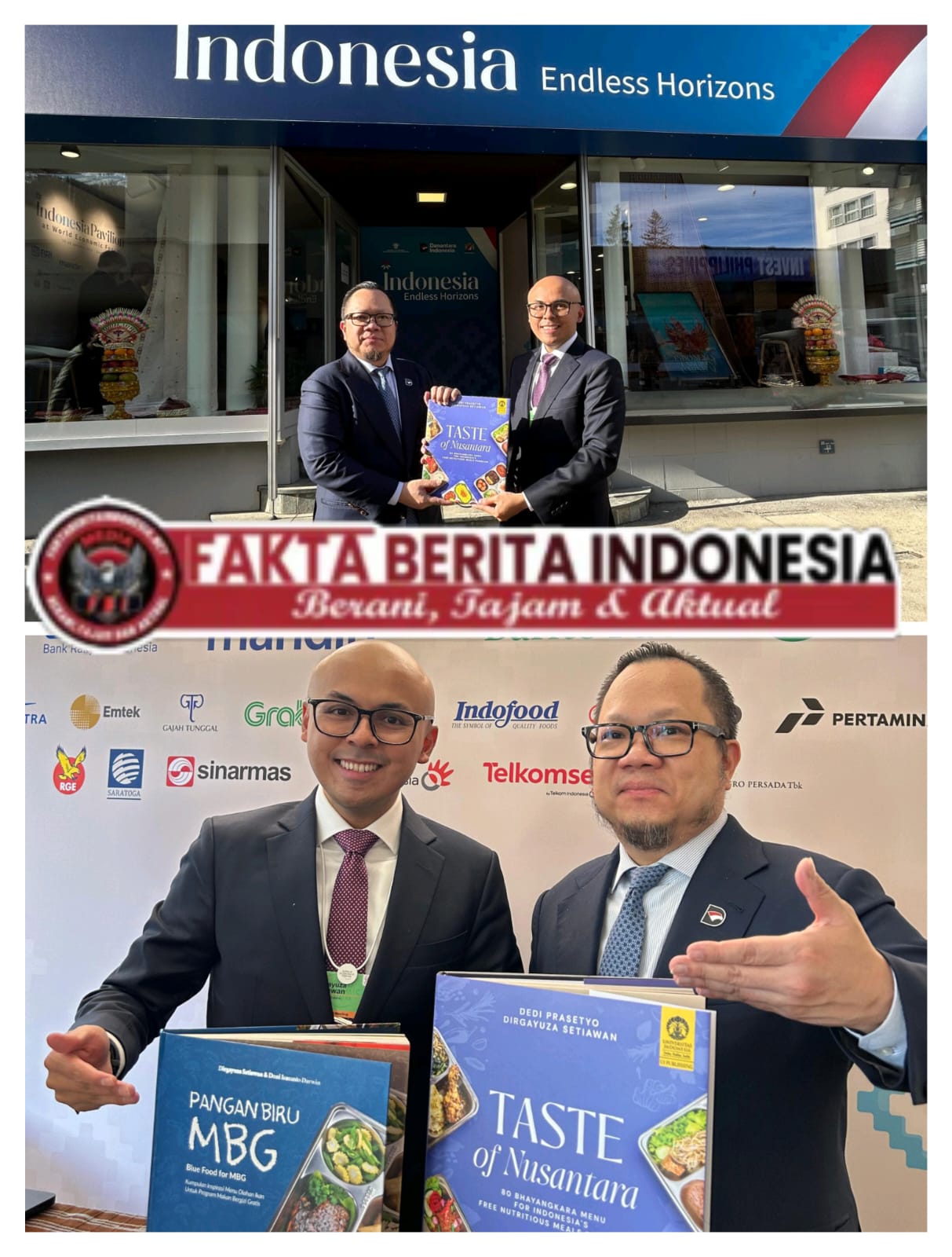 “Saya menyerahkan buku Rasa Bhayangkara Nusantara versi Bahasa Inggris kepada Bapak Stefanus Ade Hadiwidjaja, Managing Director, Investment, Danantara Indonesia, untuk ditampilkan di Paviliun Indonesia pada WEF Davos 2026 sebagai bagian dari showcase diplomasi MBG dan khazanah rasa Nusantara,” ujar Dirgayuza Setiawan.