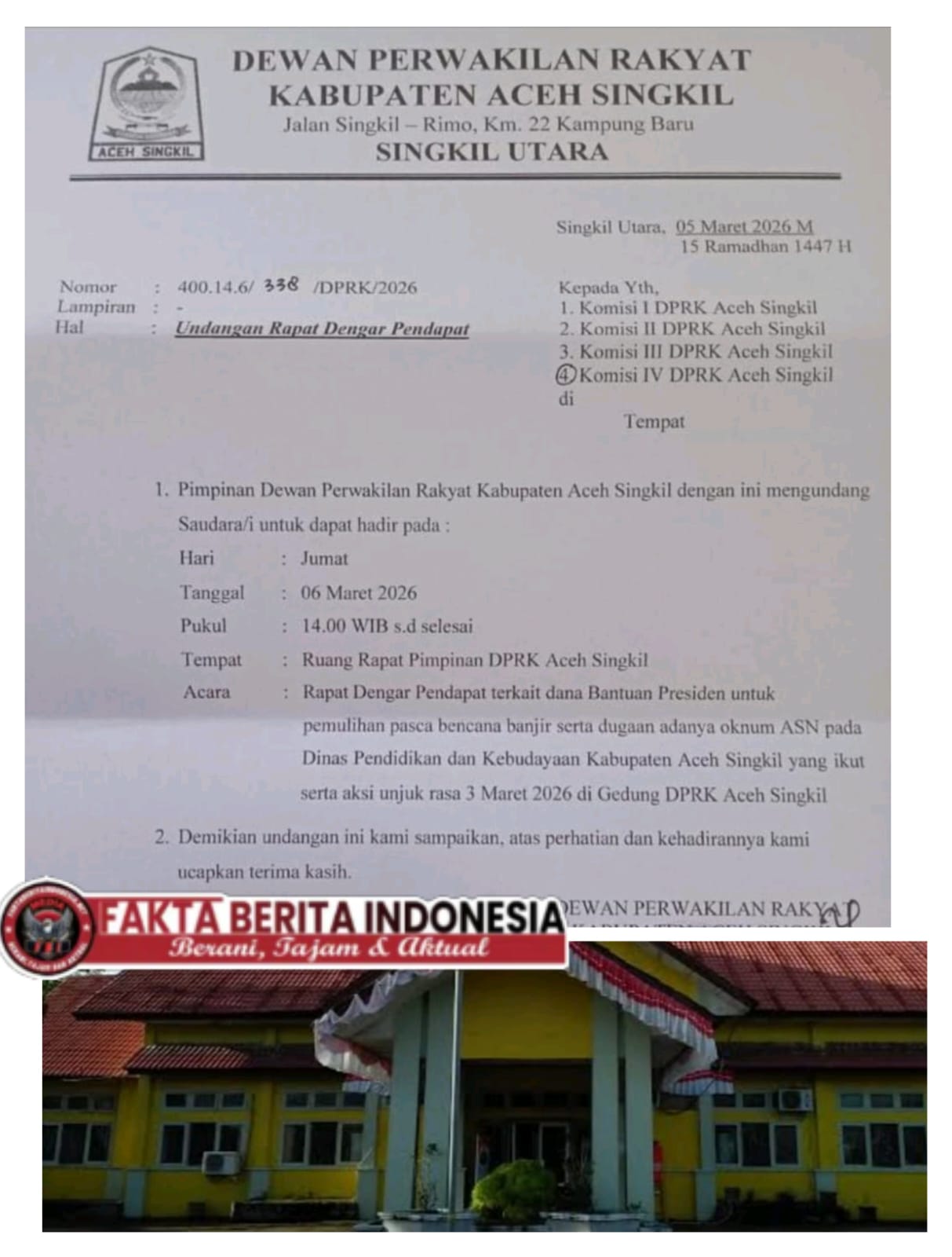 Faktaberitaindonesia.net, Aceh Singkil -Dewan Perwakilan Rakyat Kabupaten (DPRK) Aceh Singkil menggelar Rapat Dengar Pendapat (RDP) untuk membahas dugaan keterlibatan seorang oknum Aparatur Sipil Negara (ASN) dari Dinas Pendidikan dan Kebudayaan Aceh Singkil dalam aksi unjuk rasa yang terjadi beberapa waktu lalu di Kantor DPRK Aceh Singkil.. Jum’at {06/03/2026}