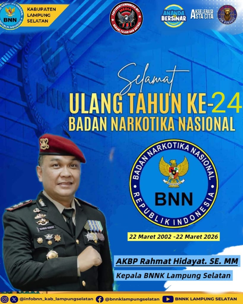 Faktaberitaindonesia.net, Lampung Selatan – Kepala BNNK Lampung Selatan AKBP Rahmat Hidayat.SE. MM., mengucapkan selamat hari jadi Badan Narkotika Nasional Republik Indonesia (BNN RI) yang ke-24 pada tanggal 22 Maret 2026. Dengan tema “Akselerasi War on Drugs Menuju Indonesia Bersinar (Bersih Narkoba)”,. Minggu, 22/03/2026.