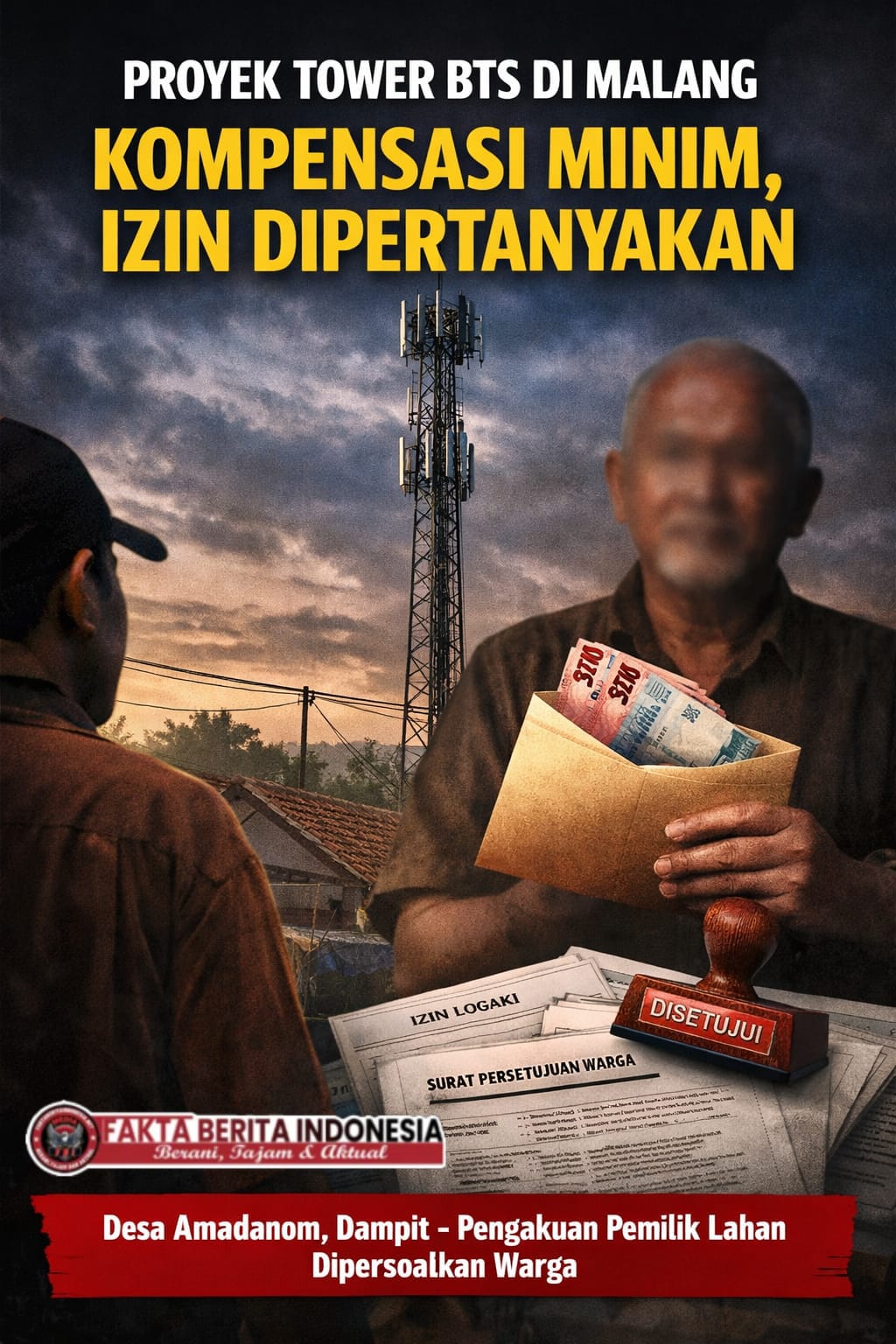 Menara itu berdiri menjulang di tengah permukiman RT 01 RW 02 Desa Amadanom, Kecamatan Dampit, Kabupaten Malang. Bagi warga sekitar, kehadirannya masih menyisakan tanda tanya—tentang proses yang tidak mereka pahami sejak awal.