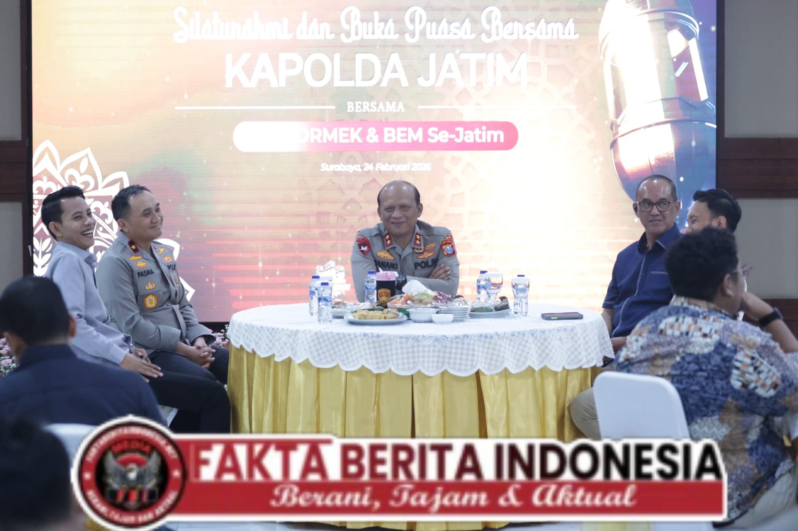 Faktaberitaindonesia.net, SURABAYA – Kapolda Jawa Timur, Irjen Pol Drs.Nanang Avianto, M.Si silaturahmi dan buka puasa bersama Badan Eksekutif Mahasiswa (BEM), Organisasi Mahasiswa Ekstra Kampus (Ormek) serta Organisasi Kemasyarakatan Pemuda (OKP) se-Jawa Timur di Selasar Gedung Patuh Mapolda Jatim, Selasa (23/2/2026).