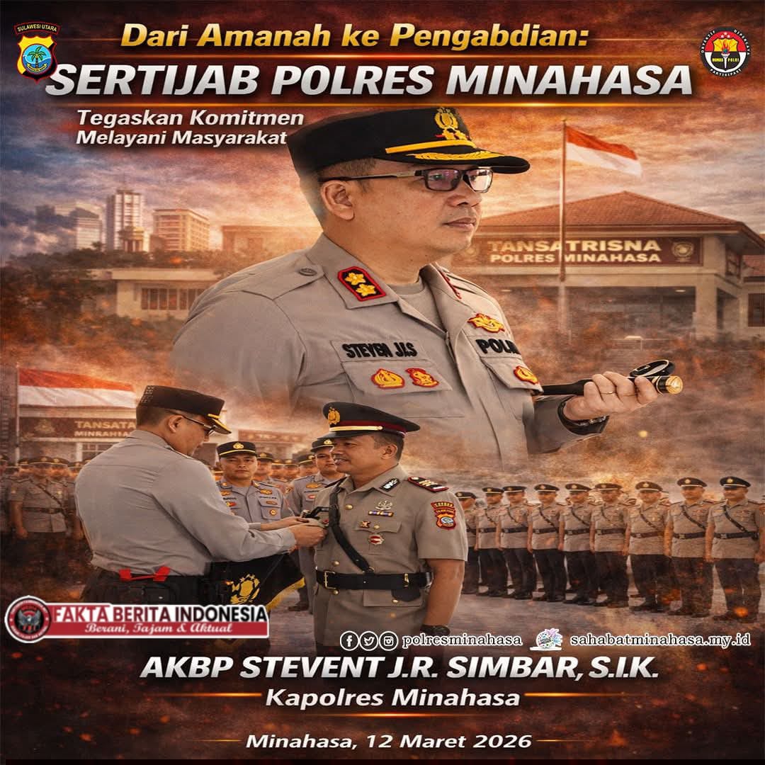 Faktaberitaindonesia.net, Minahasa – Kapolres Minahasa AKBP Steven J.R. Simbar, S.I.K. memimpin langsung Upacara Serah Terima Jabatan (Sertijab) sejumlah pejabat utama dan Kapolsek jajaran di Gedung Tansatrisna Polres Minahasa, Kamis (12/3/2026).