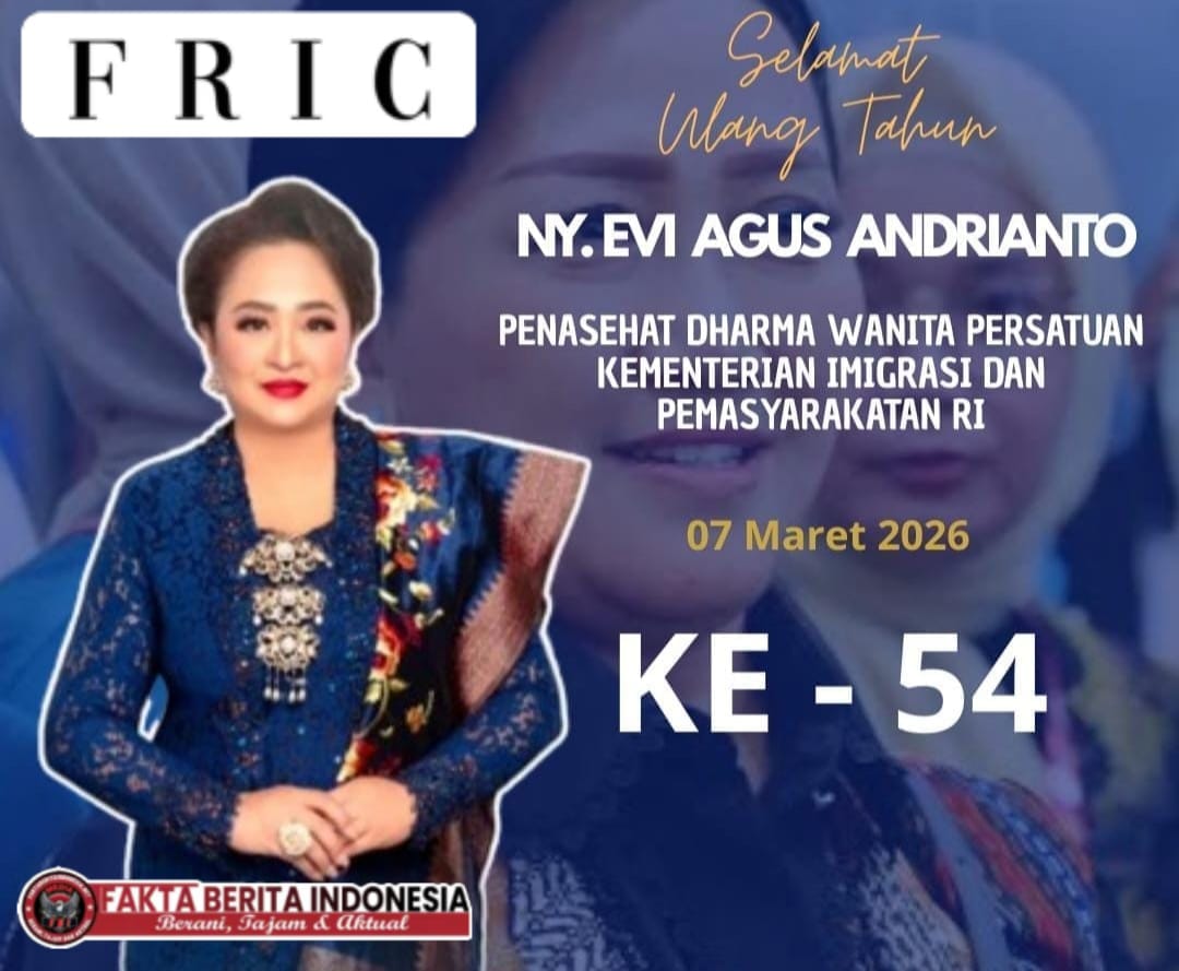 Faktaberitaindonesia.net, Jakarta — Keluarga besar Fast Respon Indonesia Center (FRIC) Presisi Polri menyampaikan ucapan selamat ulang tahun yang penuh penghormatan dan doa terbaik kepada Ny. EM Agus Andrianto, Penasihat Dharma Wanita Persatuan Kementerian Imigrasi dan Pemasyarakatan RI, yang genap berusia 54 tahun.