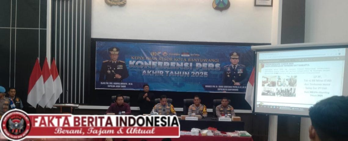 Faktaberitaindonesia.net, Banyuwangi – Kepolisian Resor Kota (Polresta) Banyuwangi mencatat kenaikan jumlah laporan polisi sebesar 16 persen sepanjang tahun 2025, namun di saat yang sama berhasil meningkatkan kinerja penyelesaian perkara secara signifikan. Hal tersebut disampaikan langsung oleh Kapolresta Banyuwangi Kombes Pol. Dr. Rama Samtama Putra, S.I.K., M.Si., M.H. dalam Konferensi Pers Akhir Tahun 2025 di Mapolresta Banyuwangi, Selasa (30/12/2025).