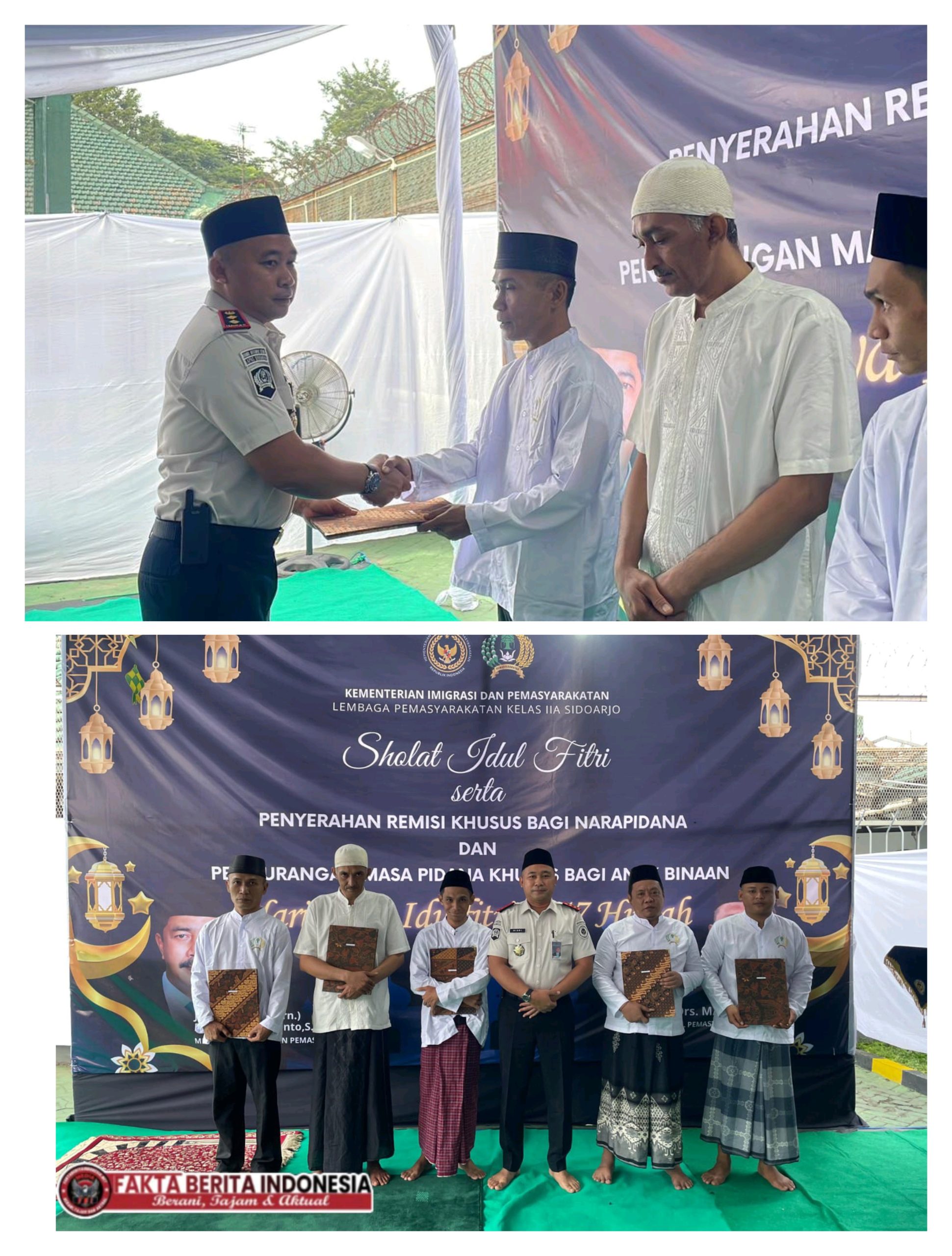Faktaberitaindonesia.net, Sidoarjo, 1 Syawal 1447 H — Lembaga Pemasyarakatan Kelas IIA Sidoarjo melaksanakan Sholat Idul Fitri yang dirangkaikan dengan pemberian Remisi Khusus Idul Fitri kepada Warga Binaan Pemasyarakatan (WBP) pada 1 Syawal 1447 Hijriah di halaman dalam Lapas. Kegiatan ini diikuti oleh seluruh WBP dan jajaran petugas sebagai bentuk pembinaan kepribadian untuk meningkatkan keimanan dan ketakwaan setelah menjalani ibadah di bulan suci Ramadan, sekaligus sebagai wujud rasa syukur dalam menyambut hari kemenangan.
