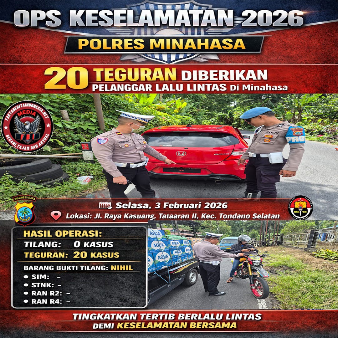 Faktaberitaindonesia.net, Minahasa – Dalam rangka pelaksanaan Operasi Keselamatan 2026, Polres Minahasa melaksanakan kegiatan penertiban lalu lintas pada Selasa, 03 Februari 2026, bertempat di Jalan Raya Kasuang, Kelurahan Tataaran II, Kecamatan Tondano Selatan.