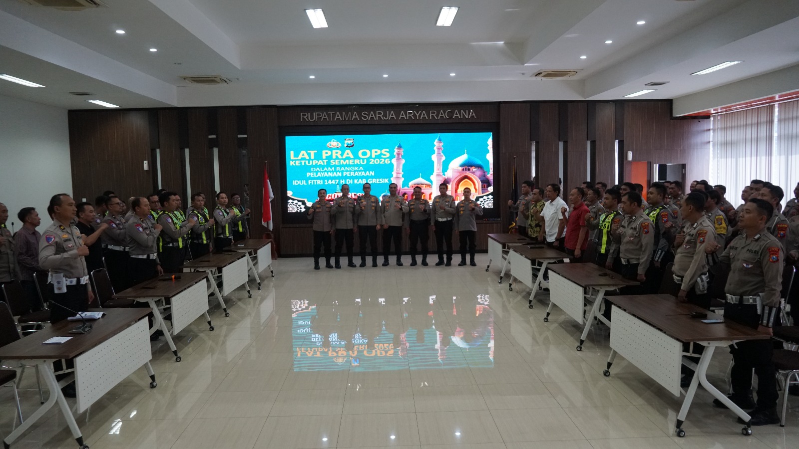 Faktaberitaindonesia.net, GRESIK – Dalam rangka mematangkan kesiapan pengamanan arus mudik dan balik Lebaran 2026, Polres Gresik menggelar Latihan Pra Operasi (Latpraops) Ketupat Semeru 2026 di Ruang Rapat Utama (Rupatama) Sarja Arya Racana, Lantai 3 Mapolres Gresik, Rabu (11/3/2026).
