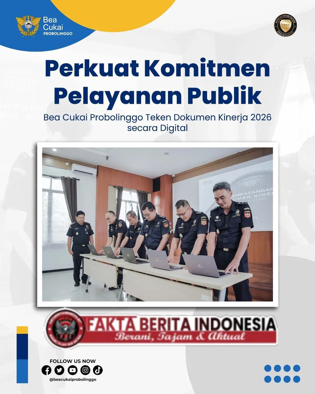 Faktaberitaindonesia.net, Probolinggo -Bea Cukai Probolinggo melaksanakan penandatanganan Dokumen Kinerja Tahun 2026 pada Jumat (30/1/2026) dengan memanfaatkan Tanda Tangan Elektronik (TTE). Pemanfaatan TTE ini menjadi wujud komitmen Bea Cukai Probolinggo dalam mendukung transformasi digital, efisiensi birokrasi, serta penguatan tata kelola pemerintahan yang akuntabel.