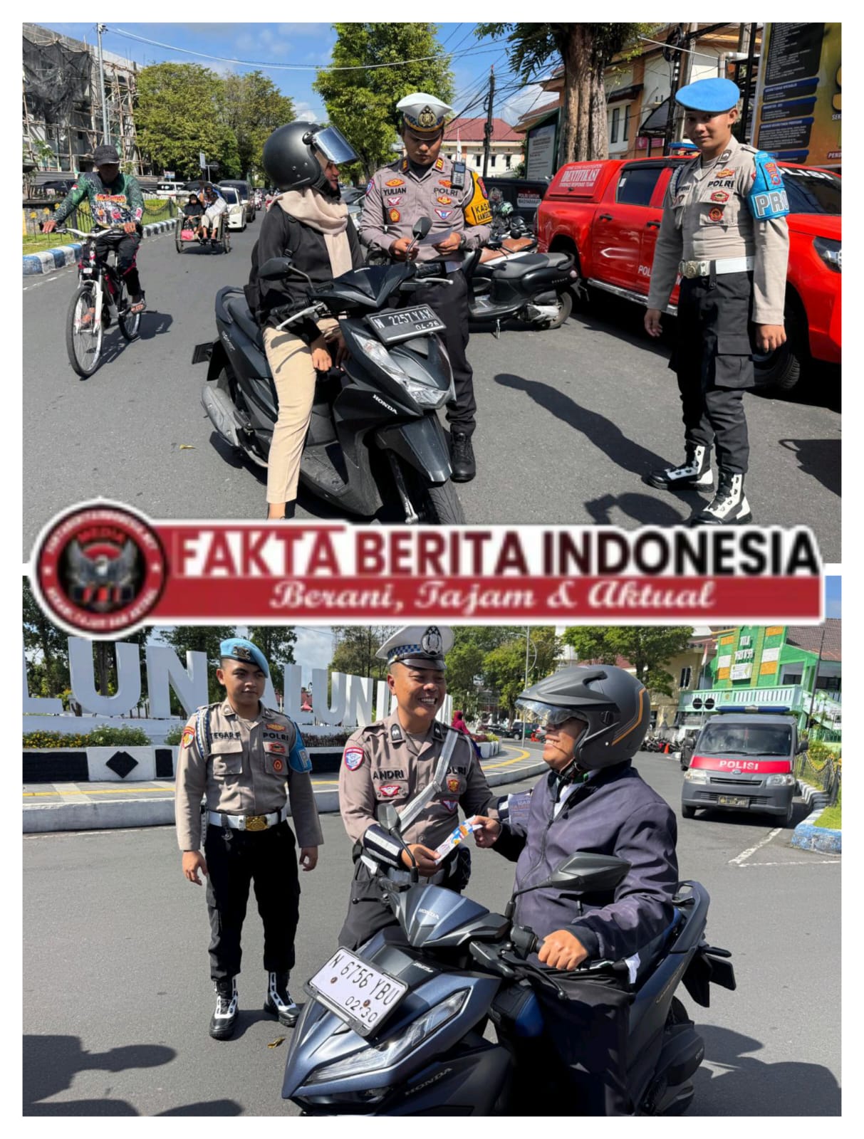 Petugas menyapa satu per satu pengguna jalan, baik pengendara roda dua maupun roda empat, sembari memberikan edukasi tentang pentingnya tertib berlalu lintas.