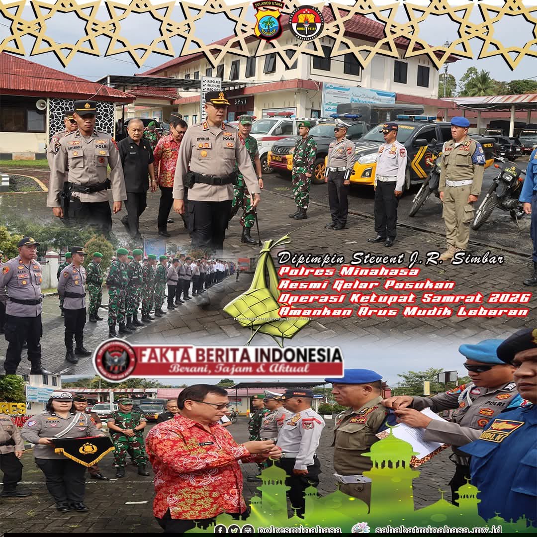 Faktaberitaindonesia.net, Minahasa – Dipimpin langsung Kapolres Minahasa Stevent J.R. Simbar, jajaran Polres Minahasa menggelar Apel Gelar Pasukan Operasi Ketupat Samrat 2026 di Lapangan Tantya Sudhirajati, Tondano. Kegiatan ini menjadi tanda kesiapan personel dalam mengamankan arus mudik dan perayaan Idulfitri 1447 H di wilayah Kabupaten Minahasa.