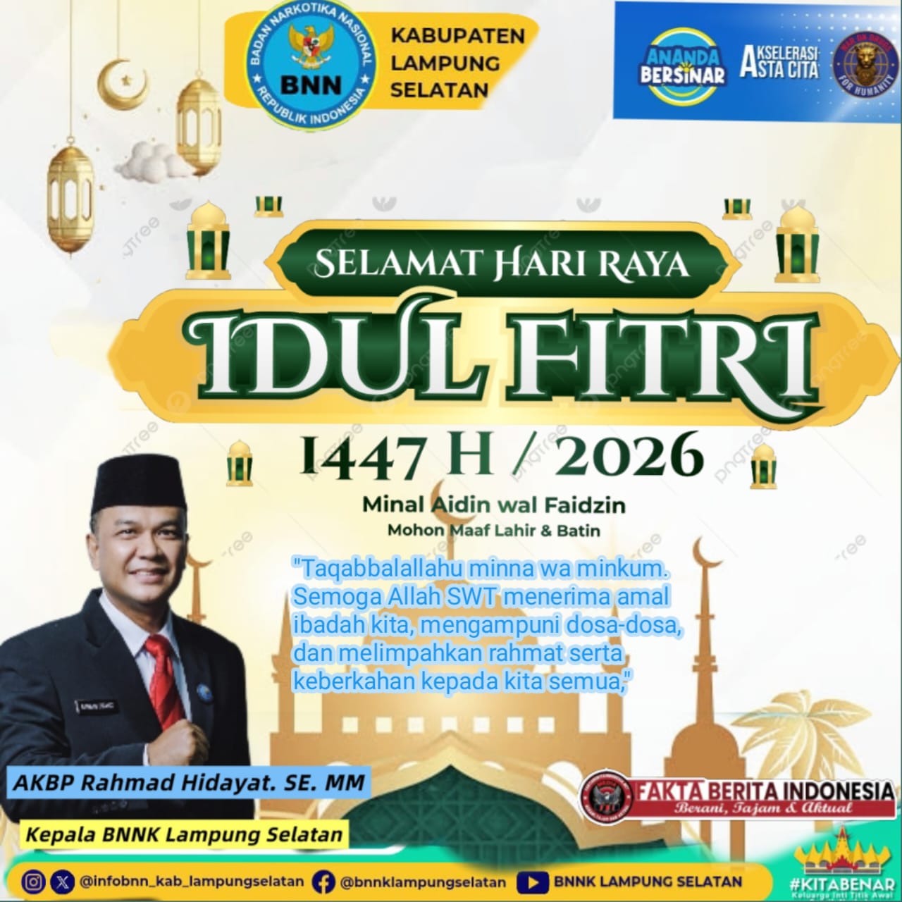 Faktaberitaindonesia.net, Lampung Selatan – Mengakhiri bulan suci Ramadan yang penuh berkah, Badan Narkotika Nasional Kabupaten (BNNK) Lampung Selatan menyampaikan ucapan selamat merayakan Hari Raya IdulFitri 1 Syawal 1447 Hijriah kepada seluruh lapisan masyarakat. Jum’at, 20/03/2026.