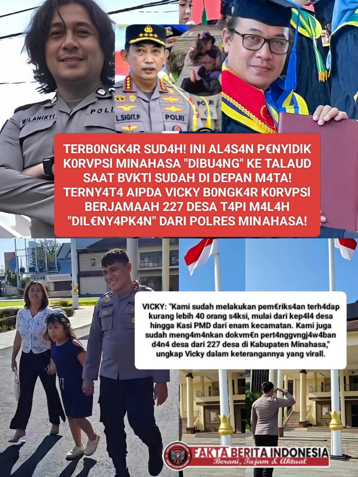 Faktaberitaindonesia.net, Minahasa -Sebuah pengakuan mengejutkan dari seorang anggota Polri bernama Aipda Vicky Katiandagho kini tengah mengguncang jagat maya. Bukan soal pelanggaran disiplin biasa, namun sebuah kesaksian tentang bagaimana sebuah penyidikan kasus Korupsi besar diduga “dijinakkan” melalui mutasi jabatan yang mendadak.