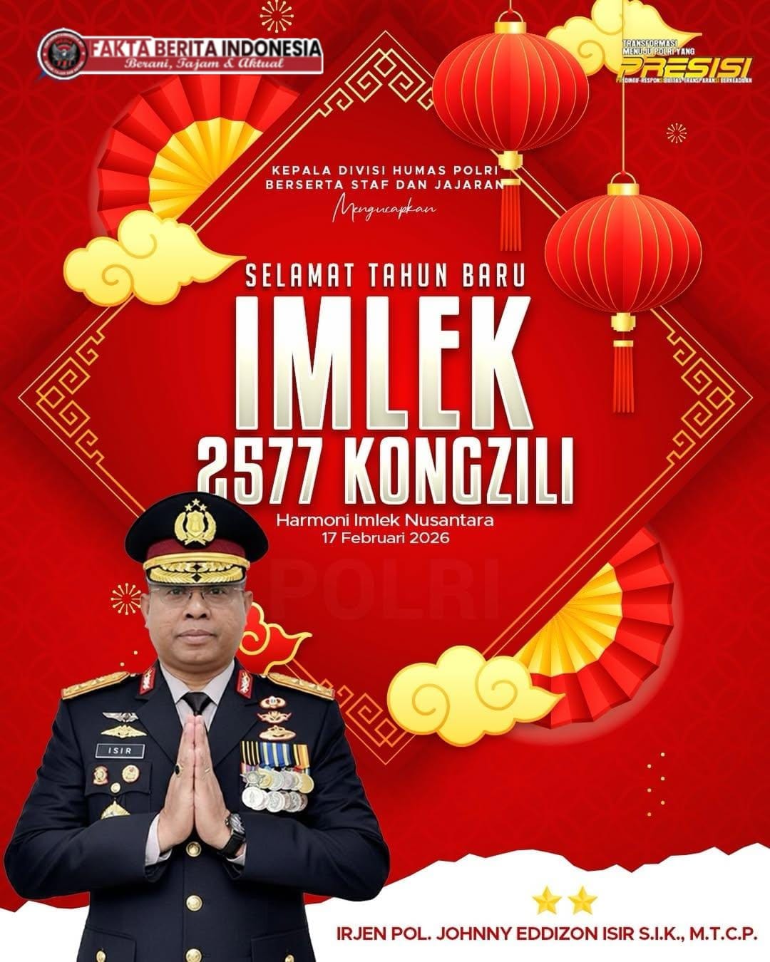Faktaberitaindonesia.net, Jakarta – Kepala Divisi Humas Polri, Irjen Pol. Johnny Eddizon Isir, S.I.K., M.T.C.P., menyampaikan ucapan selamat merayakan Tahun Baru Imlek 2577 Kongzili kepada seluruh masyarakat yang merayakannya pada Selasa, 17 Februari 2026.