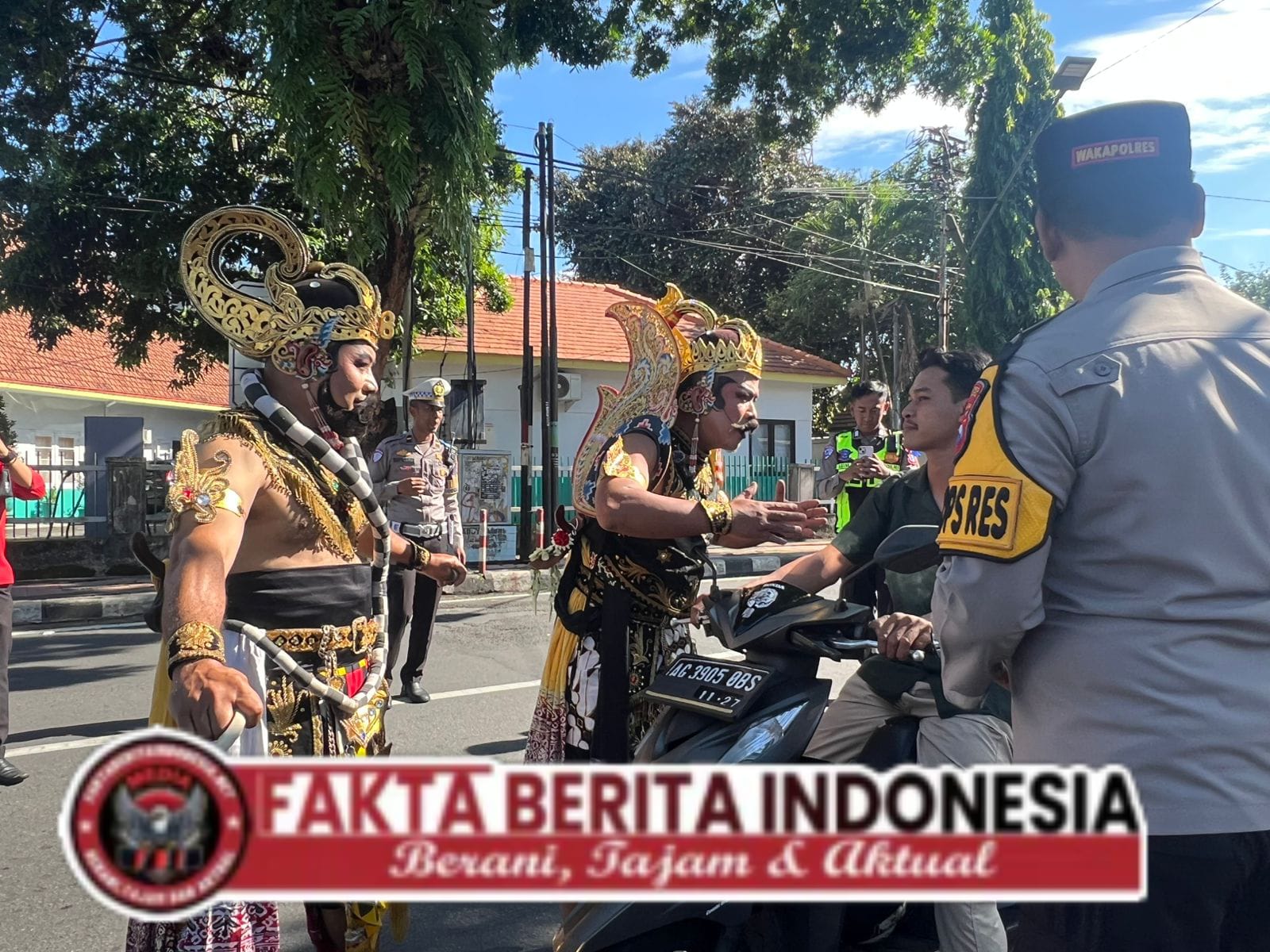 Di tengah lalu lintas kendaraan, dua tokoh pewayangan, Gatotkaca dan Werkudara, berdiri menyapa para pengguna jalan.